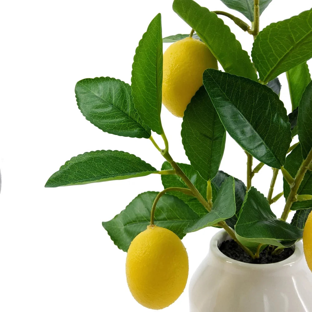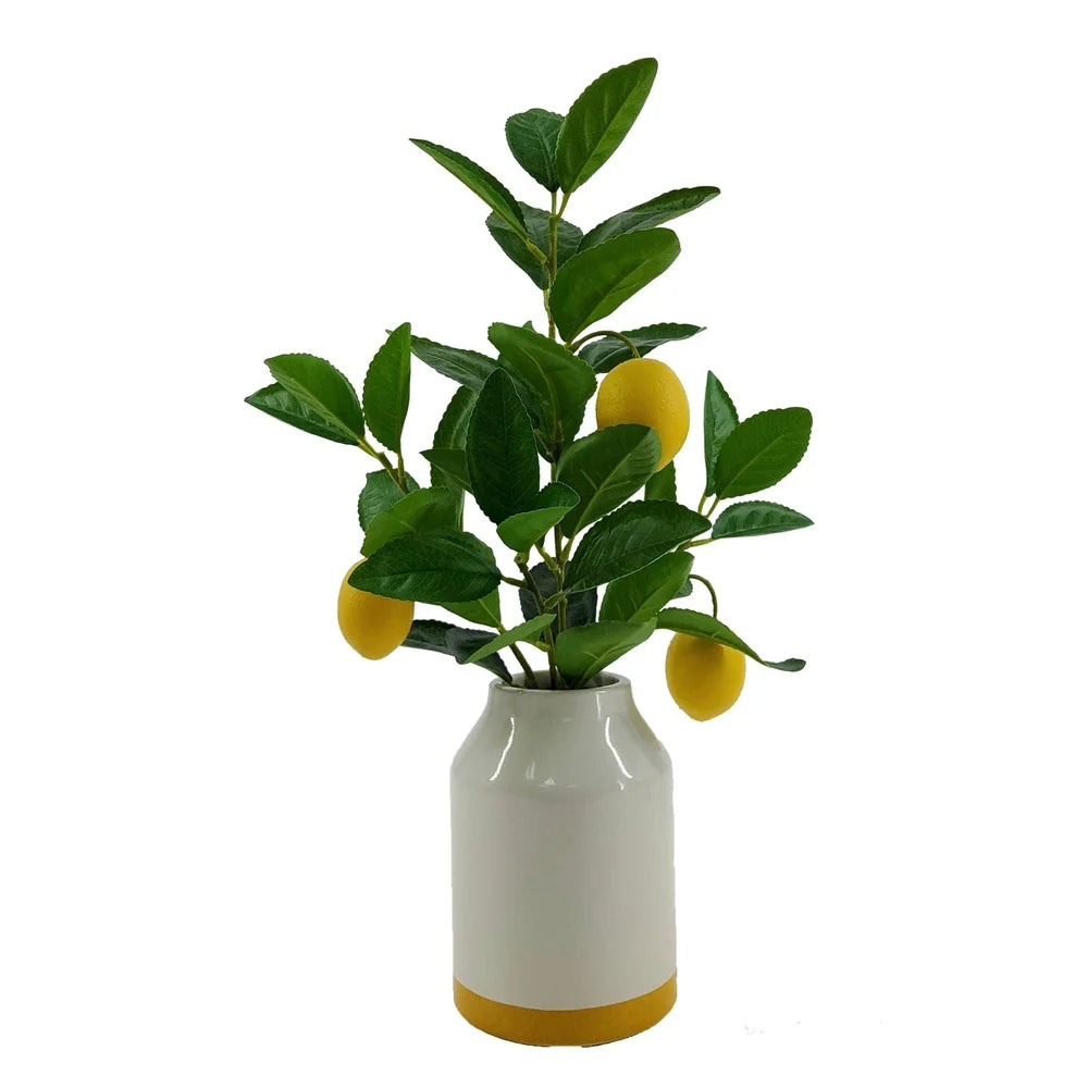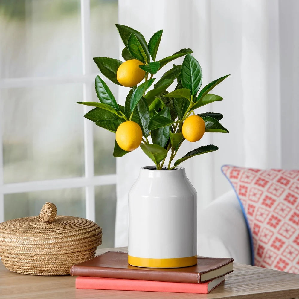 5" Artificial Lemon Tree in White Ceramic Vase. Our artificial lemons plant are unique and charm, with realistic stem and lush green leaves, the venations on the surface of the lemon leaves are clearly visible. Comes with 3 eye-catching lemon fruits, its color are close to the actual lemon fruits, which is realistic and brilliant, it will be more lifelike than other small faux lemon tree. The overall height of the small faux lemon is 14. 5". The roots are covered in faux black mud to simulate the real soil environment. Built-in cement bed to add weight to the pot so your lemon plants stand steadily. This lemon bonsai comes in a white matte pot that makes the whole arrangement simply stunning. This fake house plant will make a great addition to your home decoration, it is great for decorating your office, living room, bedroom, dining room, kitchen, dining room, entrance, garden, hotel, coffee shop, bookstore, etc. Its simple and realistic design will match any decor style perfectly. The plastic lemon fruit tree can keep long lasting beauty and fresh, it doesn't need to spend time to maintain or care for them since they never die or fade. It is suitable for those who likes plants but doesn't have time to care for plants, which will let your lemon arrangements fresh forever, enjoy the natural beauty and add a splash of vibrant.