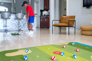 The golf mat can be used not only as a golf game scene, or an indoor and outdoor game, but also as a toss game toy hanging on the wall at your convenience; It's easy for compact storage, and portable even for kids to unroll for set up; Enjoy your sports & outdoor play toys.
